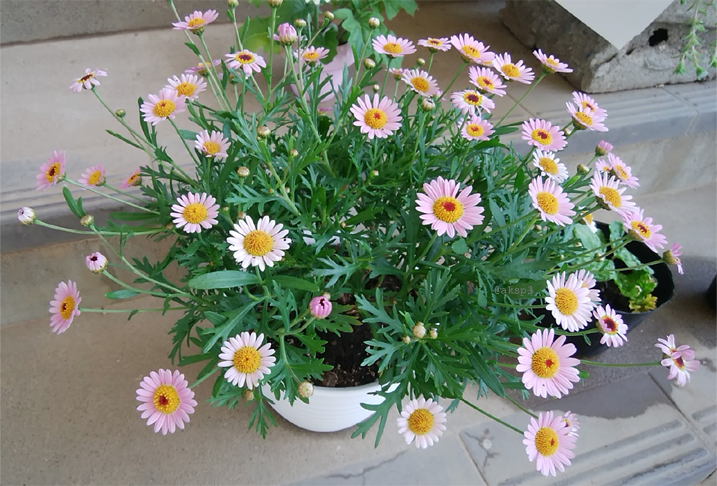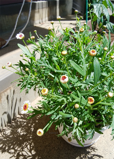 中まで乾いて鉢が軽くなったら水やり。「今日は特別天気いい予報だしこれじゃ足りないだろうなー」って時はあげとく。ガーベラほど土が少ないわけじゃないから、夕方乾いてても朝あげれば大丈夫。そういえばマーガレットは水が足りなくてしおれてるの見たことない。