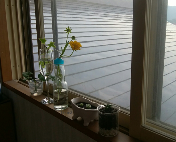 落ちてた花をせっかくだから挿してみたりして窓辺がにぎやかになってます。