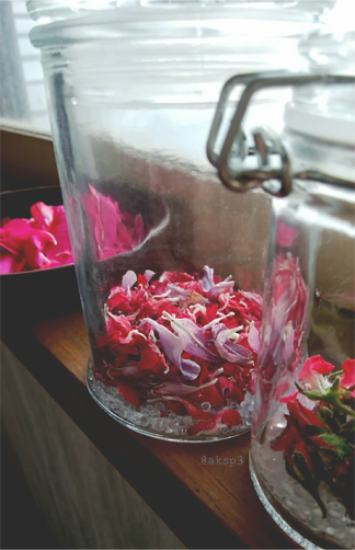 ビンを転がして混ぜると満遍なく乾くけど花びらがくしゃっとなる。