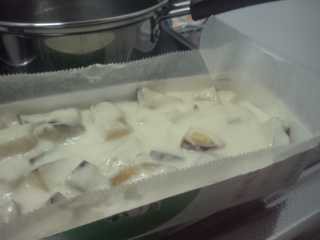 さつまいもは、別で半分使った時にあんまり甘くなかったから、ちょっと砂糖かけて鍋で煮て(蒸して?)みた。